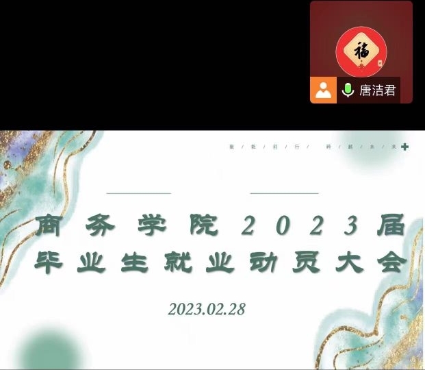 为扎实推进我院2023届毕业生就业指导工作,让毕业生明晰当前就业形势,树立正确就业观、择业观,找准合理职业定位,保持良好就业心态,最终完成就业目标。近日,商务学院组织召开2023届毕业生线上就业动员大会,会议由商务学院党总支副书记唐洁君主持。