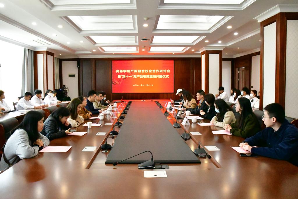 2021年11月11日,正值年度“双十一”最热时,商务学院在学校求真楼二楼举行产教融合校企合作研讨会暨“双十一”海产品电商直播开播仪式,学校党委委员、副校长李涛出席仪式,舟山本土电商相关企业的负责人、商务学院相关负责人、电子商务教研室教师及部分电子商务专业学生共同参加。