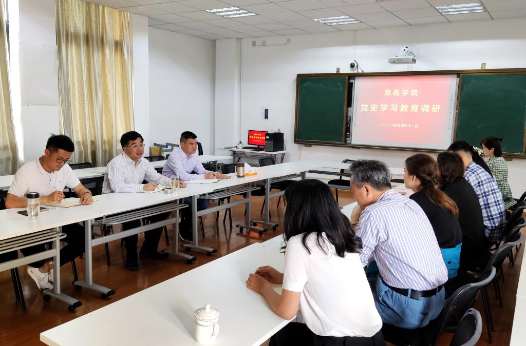 2021年5月31日下午,校党委书记姚奇富、副校长李涛、宣传部部长王尤跃、党委办公室副主任(主持)李长亮到商务学院调研党史学习教育情况。