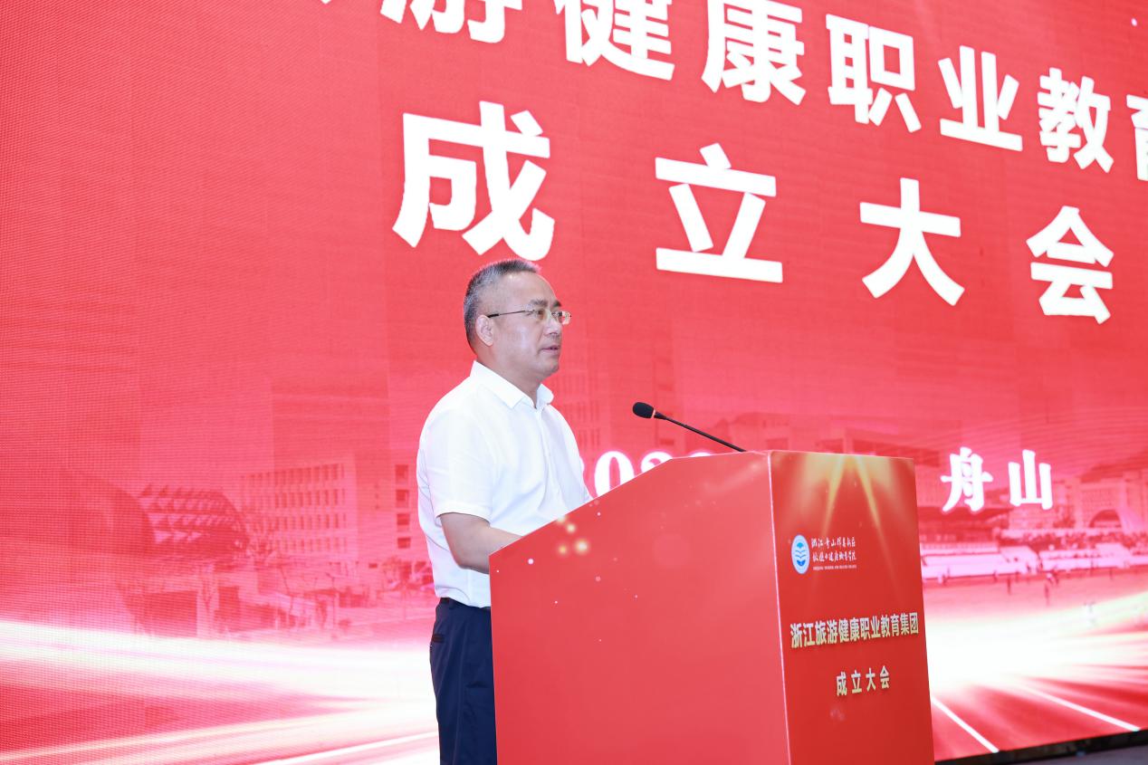 2022 年 7 月 15 日,浙江旅游健康职业教育集团成立大会在舟山海中洲国际大酒店隆重举行。舟山市政府副秘书长厉仁军,浙江省教育厅职业教育与成人教育处二级调研员祝鸿平,省文化和旅游厅科技与教育处副处长赖宋平,世界中医药学会联合会中医健康管理专业委员会副会长、浙江中医药大学党委副书记张光霁,舟山市教育局党委书记、局长陈海波,教育部示范职业教育集团、浙江旅游职业教育集团代表、浙江旅游职业学院副校长王忠林,舟山市卫生健康委员会副主任金秀国,市民政局四级调研员赵金峰,市文化和广电旅游体育局四级调研员刘君英等省市相关部门、职业院校、企事业单位、行业协会的领导和代表,以及学校党委书记姚奇富等领导班子成员出席成立大会。校长郑能波主持成立大会,副校长孔志华主持预备会议。全体中层干部参加成立大会。