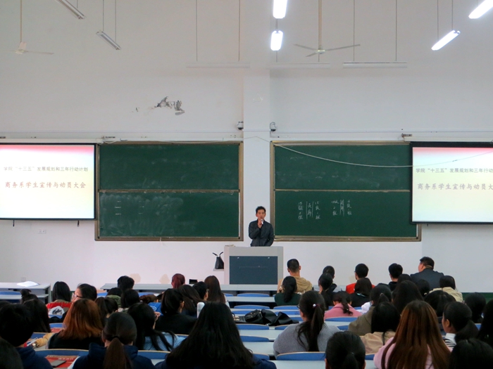 根据学院工作安排和部署,11月17日中午,商务系在教学楼117教室召开了关于学院“十三五”规划和三年行动计划的学生宣传与动员大会。商务系直属党支部副书记孙浩东老师作了动员讲话,全体商务系在校学生参加。