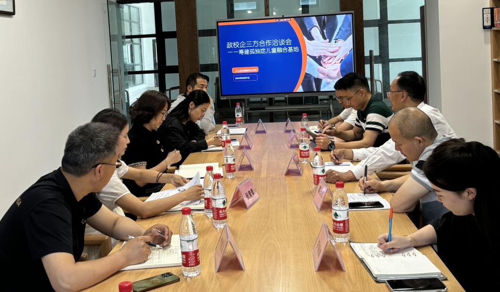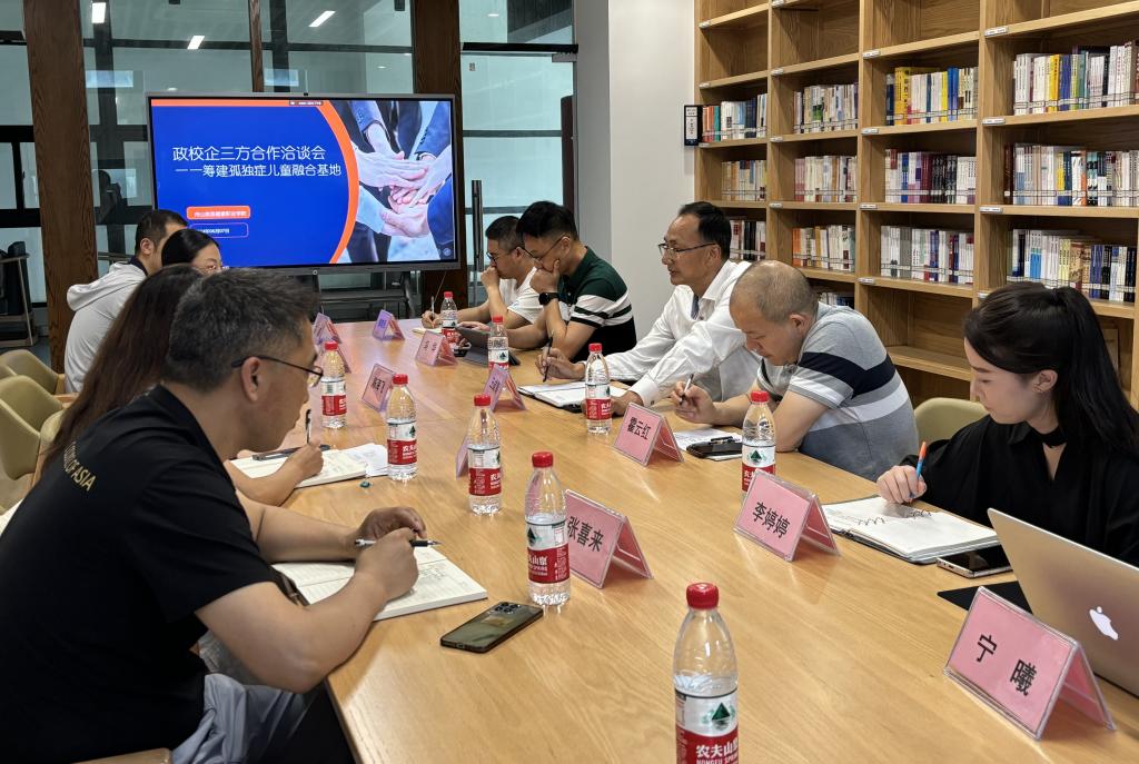 6月7日,商务学院与区残联、东大康复医院开展校企政融合座谈,在学校图书馆研讨室洽谈筹建孤独症儿童社会融合实践基地方案。