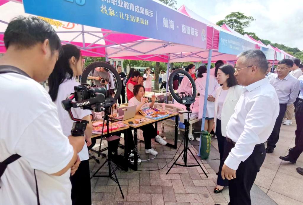 直播带货作为目前主流的渠道营销方式之一,通过真实互动与强烈的现场感,能够带给消费者强烈的购物体验。本次职业教育成果展示期间,我院共有4位电商专业学生,对各类干海产品、海洋旅游周边产品等进行直播带货。在学校活动场地,大家利用专业技能进行实操展示,吸引了外校嘉宾、校领导、师生们的驻足观看。