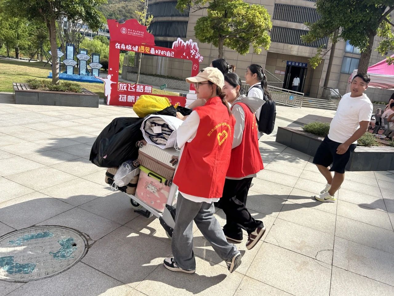 当天一大早,学长学姐们就热情地引导新生报道,主动帮忙搬运行李,为新生答疑解惑,亲切问候,校园里洋溢着青春的笑脸。新同学们也在迎新主题墙前打卡拍照,以饱满阳光的姿态迎接全新的求学生涯。