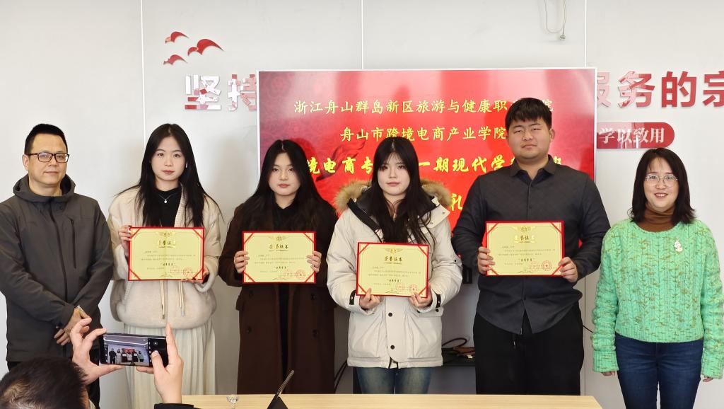 商务学院领导为9名跨境电子商务专业的学生颁发了结业证书,标志着他们顺利完成了本次学徒制项目。同时,吕欣悦、朱嘉颖、徐雯倩、朱清扬四位同学荣获了由企业与学院联合颁发的“优秀学员证书”。结业仪式的顺利举行,标志着学生们职业发展的新起点,也为我院校企合作项目树立了又一成功典范。商务学院将持续深化校企合作创新人才培养模式,努力为学生提供更多实践和就业机会,为推动舟山跨境电子商务行业的高质量发展贡献力量。